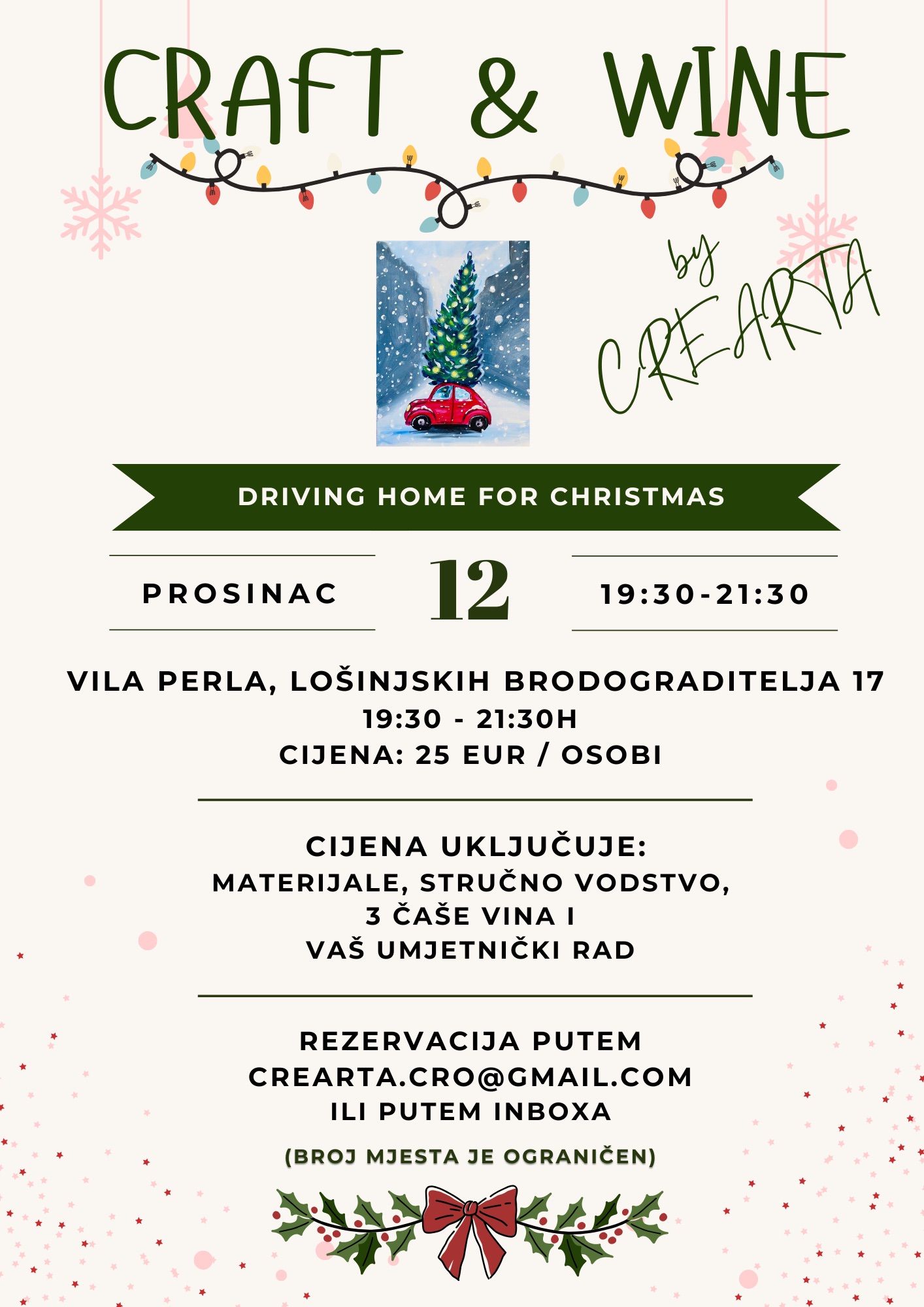 Zadnja radionica godine inspirirana je onim posebnim osjećajem povratka - svjetlima ceste, poznatom glazbom i tišinom u kojoj se polako stiže kući. Uz čašu domaćeg vina, opuštenu atmosferu i božićni ugođaj, pretočit ćemo blagdansku nostalgiju i toplinu doma u vlastita platna. 🎨🤍