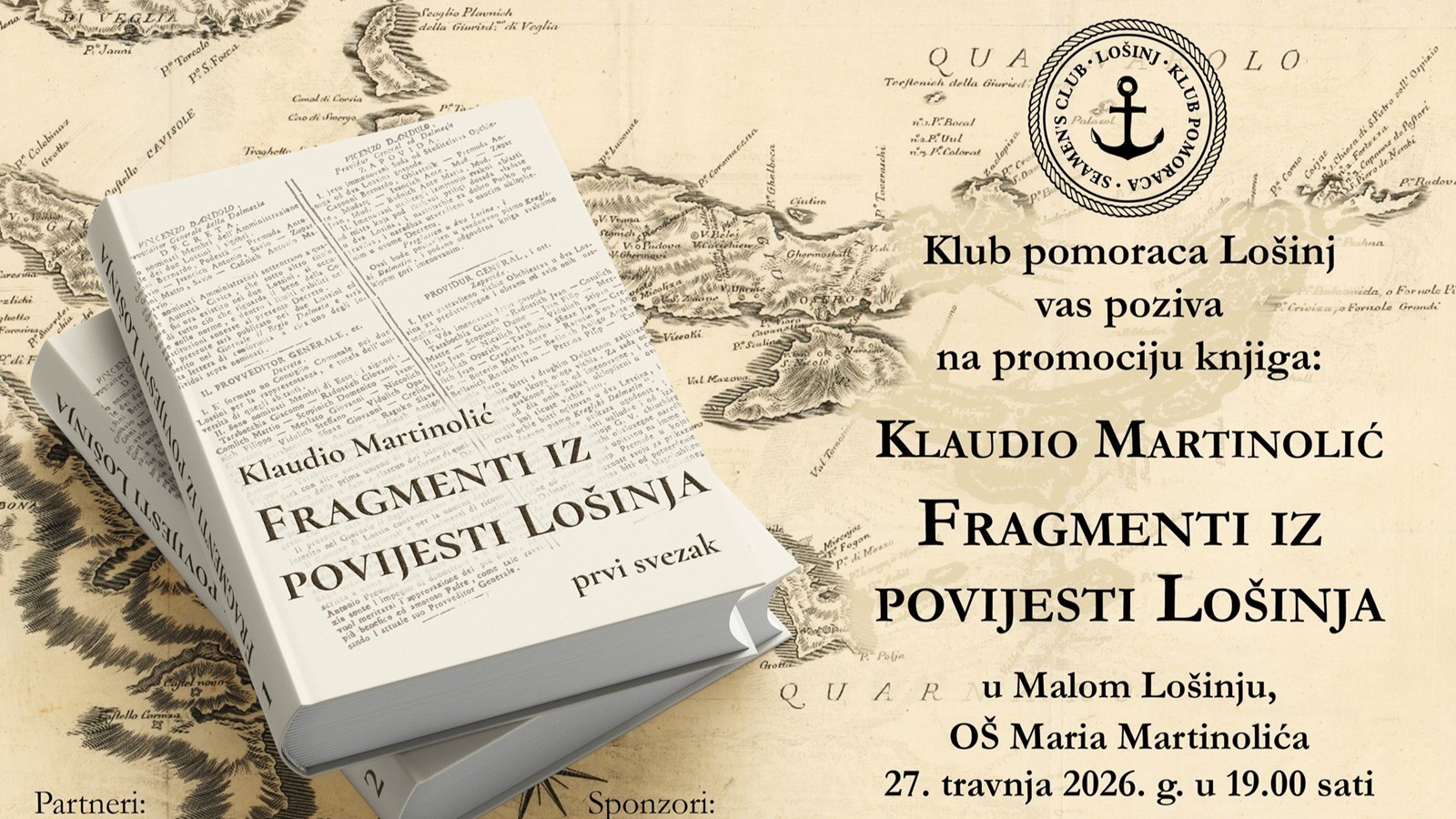 Klub pomoraca Lošinj poziva na predstavljanje knjiga autora Klaudia Martinolića “Fragmenti iz povijesti Lošinja”, svezak 1 i 2. Ova opsežna izdanja, na ukupno 1200 stranica, donose zanimljive i manje poznate priče iz bogate prošlosti našega otoka te su nezaobilazno štivo za sve koji žele bolje upoznati lošinjsku baštinu.