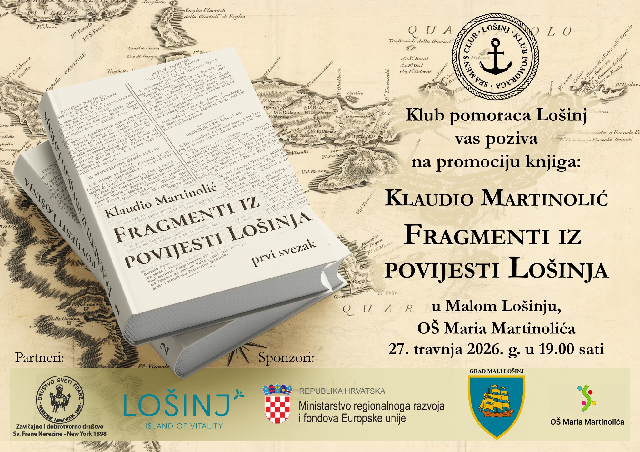 Predstavljanje će se održati u ponedjeljak, 27. travnja 2026. godine, s početkom u 19:00 sati, u hodniku Osnovne škole Maria Martinolića u Malom Lošinju.