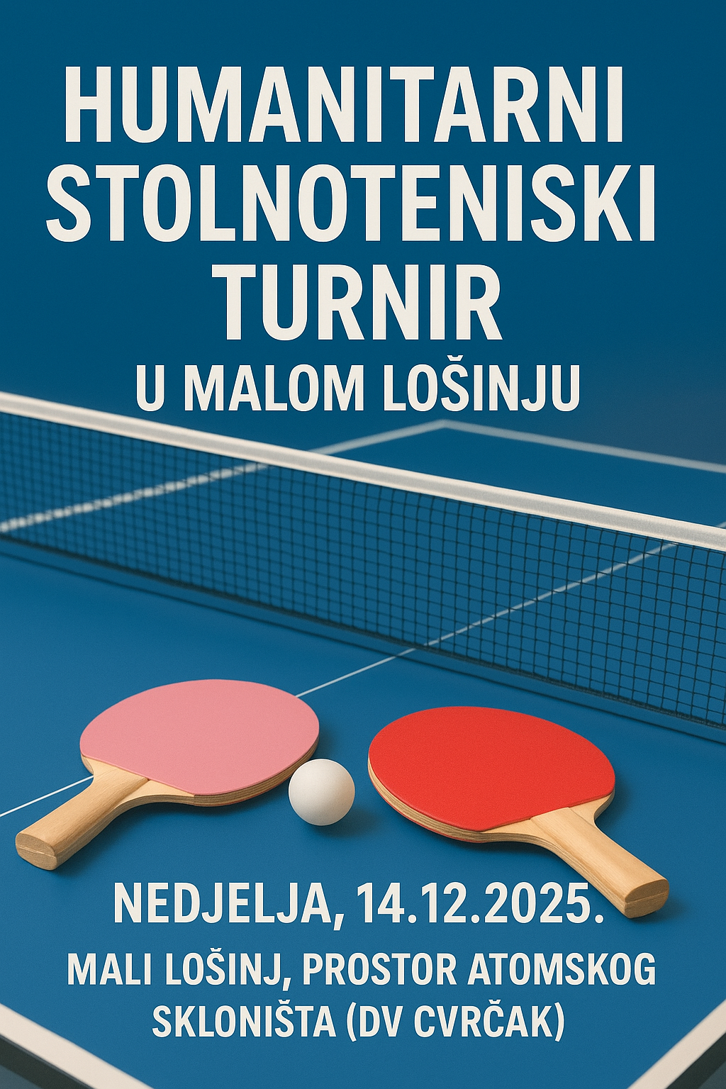 Humanitarni rekreativni stolnoteniski turnir održat će se 14.12.2025. u 14 sati u Malom Lošinju, u prostoru Atomskog skloništa (DV Cvrčak), a sav prihod od kotizacija bit će namijenjen u humanitarne svrhe.