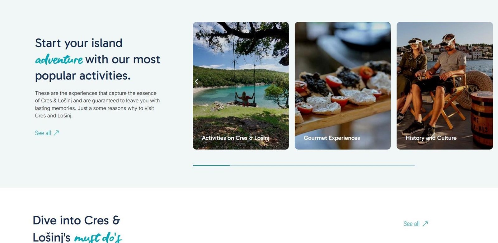 Riječ je o službenoj platformi za promociju i online prodaju turističkih doživljaja na području Grada Cresa i Grada Malog Lošinja, koja na jednom mjestu objedinjuje raznoliku ponudu aktivnosti i iskustava – od eno-gastronomije i outdoor aktivnosti do kulturnih i autentičnih lokalnih doživljaja – koje posjetitelji mogu jednostavno pretraživati i kupiti na jednom mjestu, kroz tematski organizirane kategorije poput sadržaja vezanih uz baštinu i kulturu, prirodu i boravak na otvorenom, aktivnosti na moru, radionice, različite vrste aktivnosti te gastronomske doživljaje.
