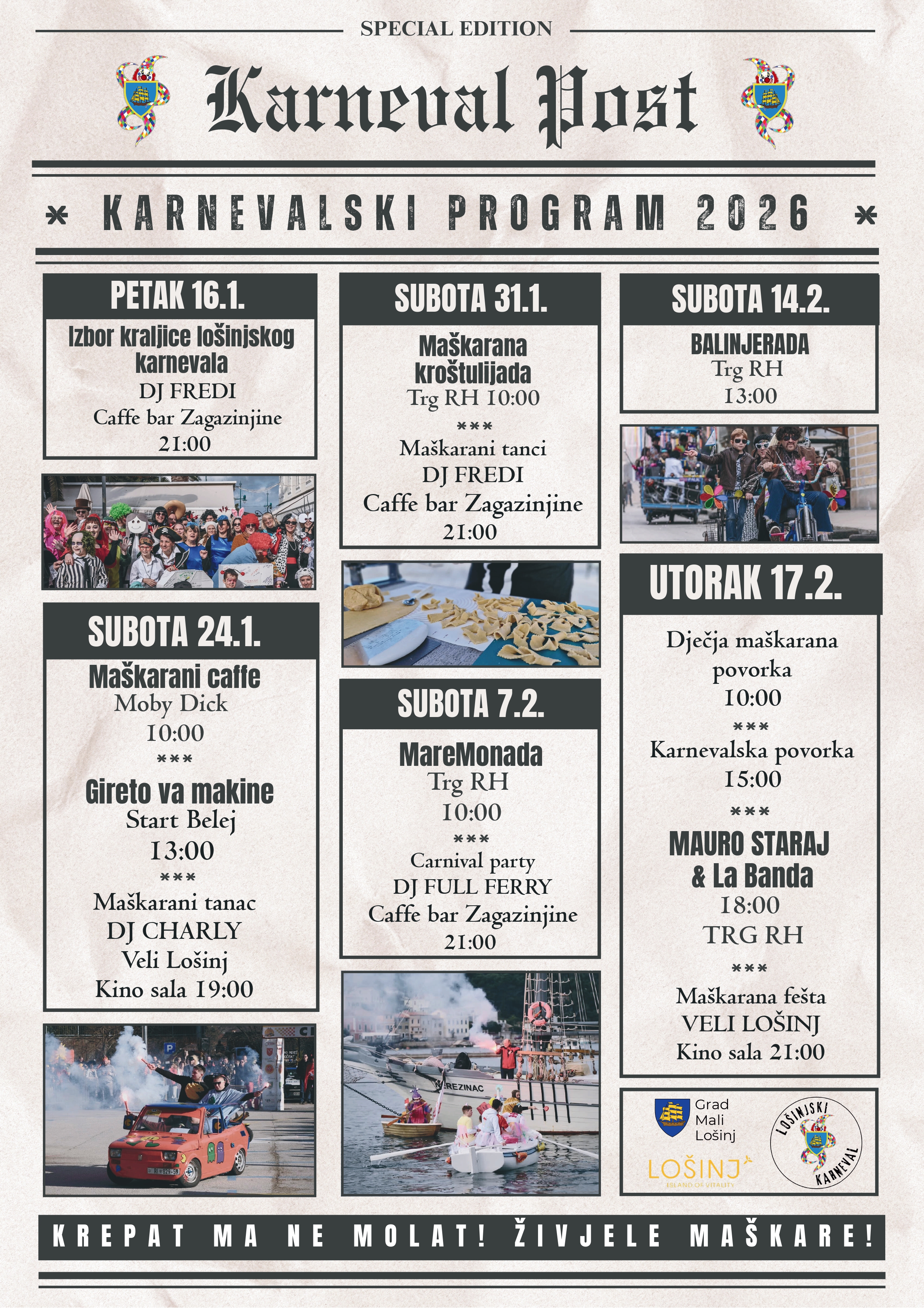 Pridružite nam se u veselju i šarenilu tradicionalnog Lošinjskog karnevala koji počinje 16. siječnja predajom ključeva grada, a završava velikom karnevalskom povorkom i spaljivanjem PUSTA na Pusni utorak, 17. veljače 2026!