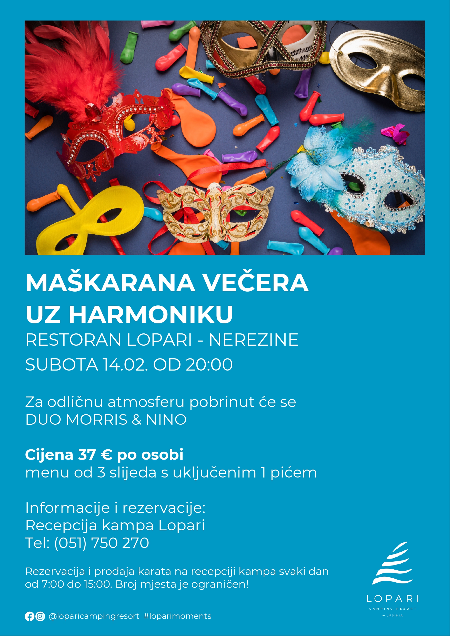 Maškarana večera uz harmoniku donosi večer punu zabave u ugodnom ambijentu restorana Lopari uz živu glazbu i jelovnik s 3 slijeda i uključenim 1 pićem po cijeni od 37 € po osobi.