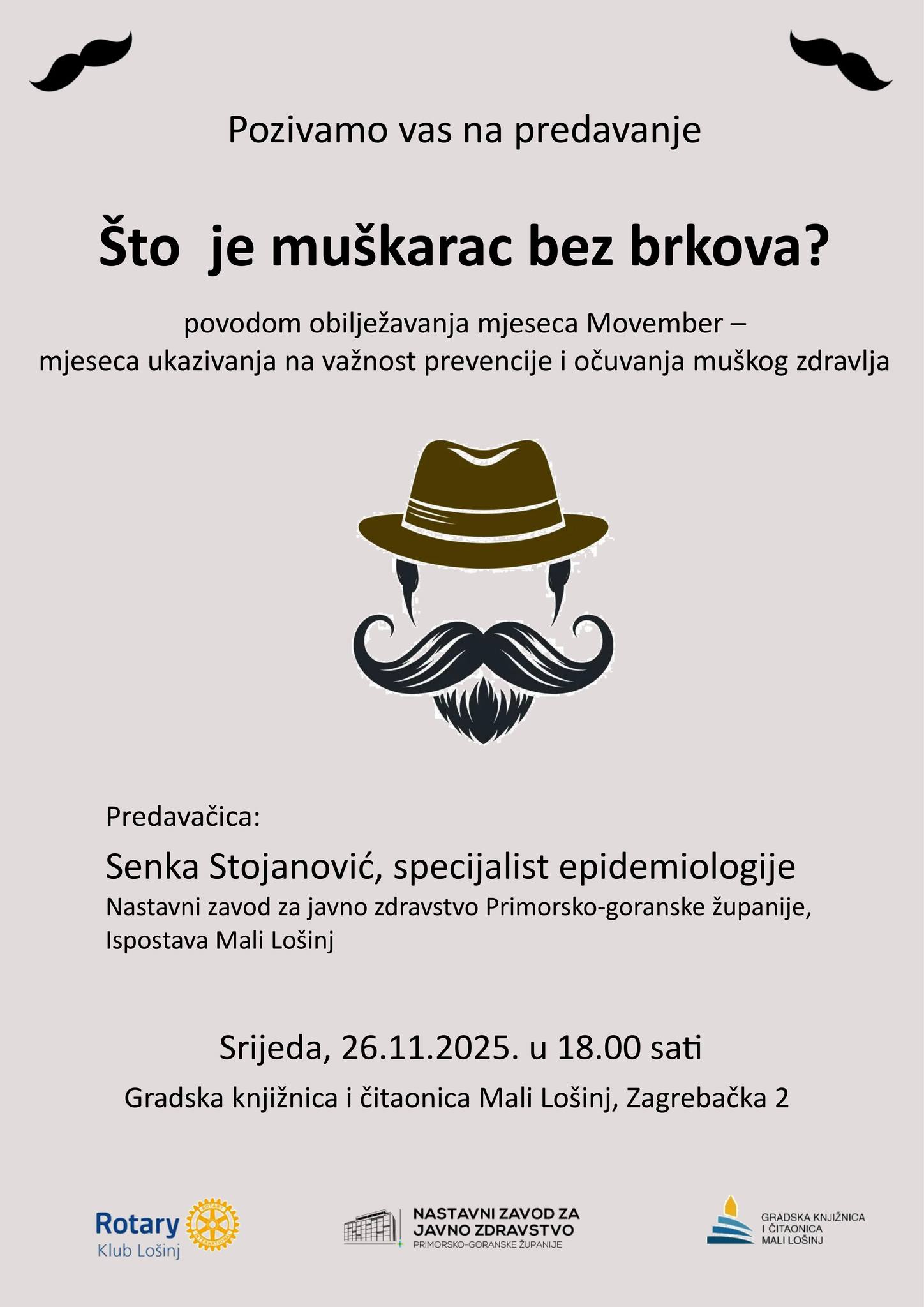 Povodom obilježavanja mjeseca Movember - mjeseca ukazivanja na važnost prevencije i očuvanja muškog zdravlja, u Gradskoj knjižnici i čitaonici Mali Lošinj 626. studenog u 18 sati održat će se predavanje "Što je muškarac bez brkova?".